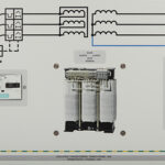 Transformator für Einspeisung der Leitungsnachbildung. Maßstabsfaktor 1/1000 für Strom und Spannung der Sekundärseite.