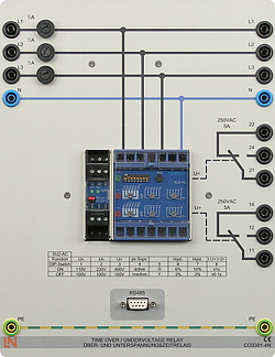 Lehrplatte mit digitalen Über-/Unterspannungsrelais (Industrieausführung) zur Überwachung von Zwei-, Drei- und Vierleiternetzen auf unzulässige Über- bzw. Unterspannungen (Erdschluss) mit Phasenfolgeüberwachung (ANSI 27 und 59). Der Ansprechwert und die Auslösezeit der Über-/Unterspannungsauslösung ist getrennt einstellbar. Die Parametrierung des Relais kann wahlweise von Hand oder mit einem PC über die integrierte RS485 Schnittstelle erfolgen. Nennspannung: 100V / 110V / 230V / 400V Nennfrequenz: 45…66Hz Leistungsaufnahme: 3,5VA Thermische Belastbarkeit: ständig 1,3x UN Rückfallverhältnis: einstellbar durch Hysterese Rückfallzeit: 300ms Ansprechzeit: min. 300ms Ausgangsrelais: Einschaltstrom: 20A Nennstrom: 5A Max. Schaltleistung: 1250VA AC/120W DC ohmisch 500VA AC/75W DC induktiv LED-Anzeigen: „U“ = Auslösung (Dauerlicht) Bedienelemente: Potentiometer für U/UN 95%…120% Potentiometer für t 0s…10s Potentiometer für Differential 2%…10% Ein- und Ausgänge: 4mm-Sicherheitsbuchsen Die integrierte Schnittstelle RS 485 ist für die Parametrierung von Schutzrelais geeignet. Sie erfasst und überträgt Werte vom Relais zum PC und zurück. Durch eine optische Übertragung der Signale wird eine galvanische Trennung gewährleistet. Anzeige der Schnittstelle: 1. LED grün = Betriebsanzeige 2. LED grün = Datenübertragung Abmessungen: 297 x 114 x 125mm (HxBxT) Gewicht: 1,0 kg