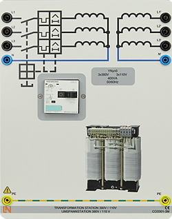 Transformator für Einspeisung der Kabelnachbildung. Maßstabsfaktor 1/1000 für Strom und Spannung der Sekundärseite.