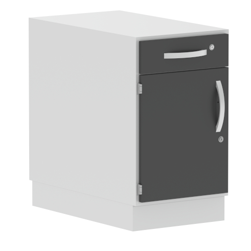 Bodenständiger Unterschrank zur Beistellung an Labortische (Erweiterung der Arbeitsfläche), bzw. zum Aufbau eines Arbeitsplatzes (Sockel für eine Tischplatte). 1 Schublade, abschließbar, 2HE, Nutzbreite 330mm, Nutztiefe 480mm 1 Flügeltüre links angeschlagen, abschließbar 1 Fachboden Metallschublade mit umlaufender Steckschlitzreihe Schublade mit 100% Vollauszug und Einzugsdämpfer (soft close) Korpus und Fronten aus 19mm starker hochverdichteter mehrschichtiger Feinspanplatte mit beidseitiger Kunststoffbeschichtung der Güteklasse E1 Korpus grau (RAL7035), Fronten anthrazit (RAL7016) Weitere Frontenfarben auf Anfrage möglich Abmessungen: 430x740x750mm (B x H x T)