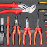 Schubladen-Werkzeugeinsatz VDE/elektrische Installationstechnik 1 – Zangensatz, bestehend aus 12 Teilen in zweifarbiger (schwarz/grau) Schaumeinlage in den Maßen 300x600mm, passend für Schubladen mit einer Blendenhöhe von mindestens 100mm. – VDE-Werkzeuge mit geriffelter Greiffläche, Schenkel VDE isoliert bis 1.000V, nach EN 60900/IEC 60900:2004 – Zangen nach DIN ISO 5745 und 5746 – Zangen aus Vergütungsstahl C45 / 1.0503, Seitenschneider aus Vergütungsstahl C60 / 1.0601 – Maximale Standzeit durch induktive Zusatzhärtung Set bestehend aus: VDE-Flachrundzange VDE-Flachrundzange, 90° abgewinkelt VDE-Kombinationszange VDE-Abisolierzange mit Stellschraube für Kabelquerschnitte 0,8-6mm² VDE-Kraft-Seitenschneider VDE-Universal-Seitenschneider Ader-Endhülsen-Zange, PVC-tauchisoliert VDE Wasserpumpenzange mit Tauchisolation (Chrom-Vanadium 31CrV3 / 1.2208) Abisolierzange, selbsteinstellend für Kabelquerschnitte 0,2-6mm² Rundkabel-Entmanteler für Kabel von 8-13mm Ø, automatische Einstellung auf die Schnitttiefe Universal Kabelmesser für Kabel von 4-28mm Ø, Klinge aus gehärtetem Spezialstahl, Griff aus Kunststoff VDE-Kabelmesser mit gerader Klinge, gehärtet, Klinge aus rostfreiem Stahl, mit schlagfester Isolations-Griffschutzhülle