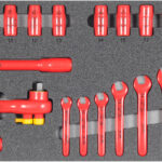 Schubladen-Werkzeugeinsatz VDE/elektrische Installationstechnik 2 – Schlüsselsatz, bestehend aus 23 Teilen in zweifarbiger (schwarz/grau) Schaumeinlage in den Maßen 300x600mm,