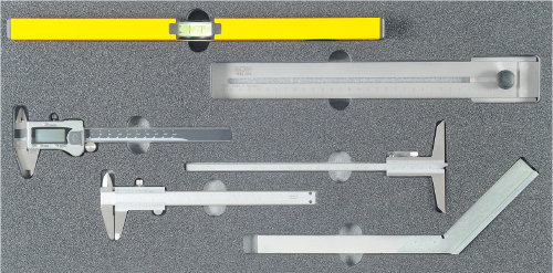 Metalltechnik Werkzeugsatz 7 (6 Teile) – Messwerkzeuge I, passend für Schubladen mit einer Blendenhöhe von mindestens 100mm. 3 Messschieber Streichmaß Wasserwaage Gehrungswinkel