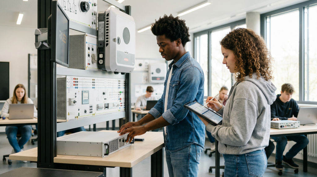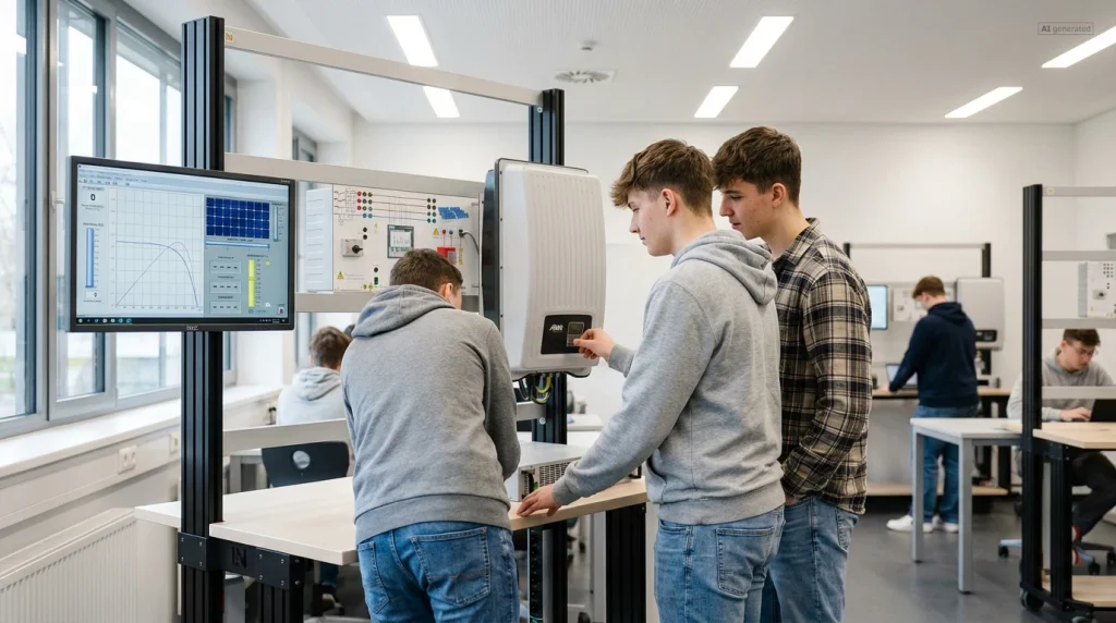 Mit diesem System installieren, konfigurieren und analysieren Lernende eine komplette, netzgekoppelte PV-Anlage mit modernem Hybrid-Wechselrichter. Sie führen praxisnahe Experimente sicher im Labor durch – unabhängig von Wetterbedingungen.
